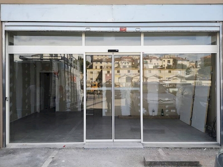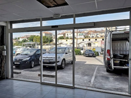 une porte automatique et de 2 châssis fixes latéraux, ainsi qu'un grand châssis et un faux plafond en